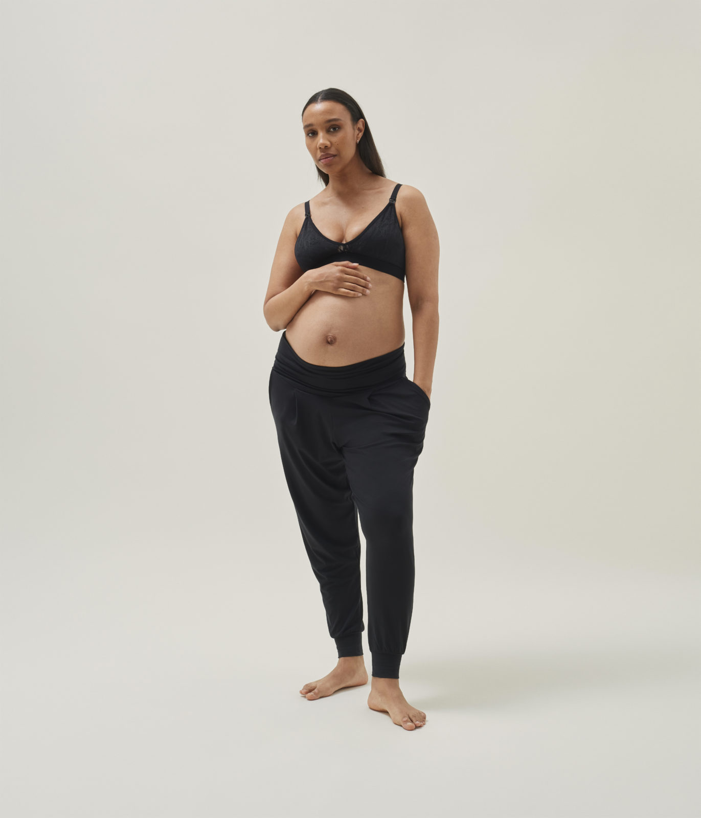 The OONO easy pants are back! Crafted from a luxurious blend of bamboo, cotton, and elastane, these Soft maternity sweatpants offer unparalleled softness and comfort. They feature cuffs at the ankles, convenient side pockets, and a flexible waistband that can be folded down or worn over your baby bump. Perfect for lounging or casual wear, the OONO easy pants should come with a warning: you might never want to take them off!