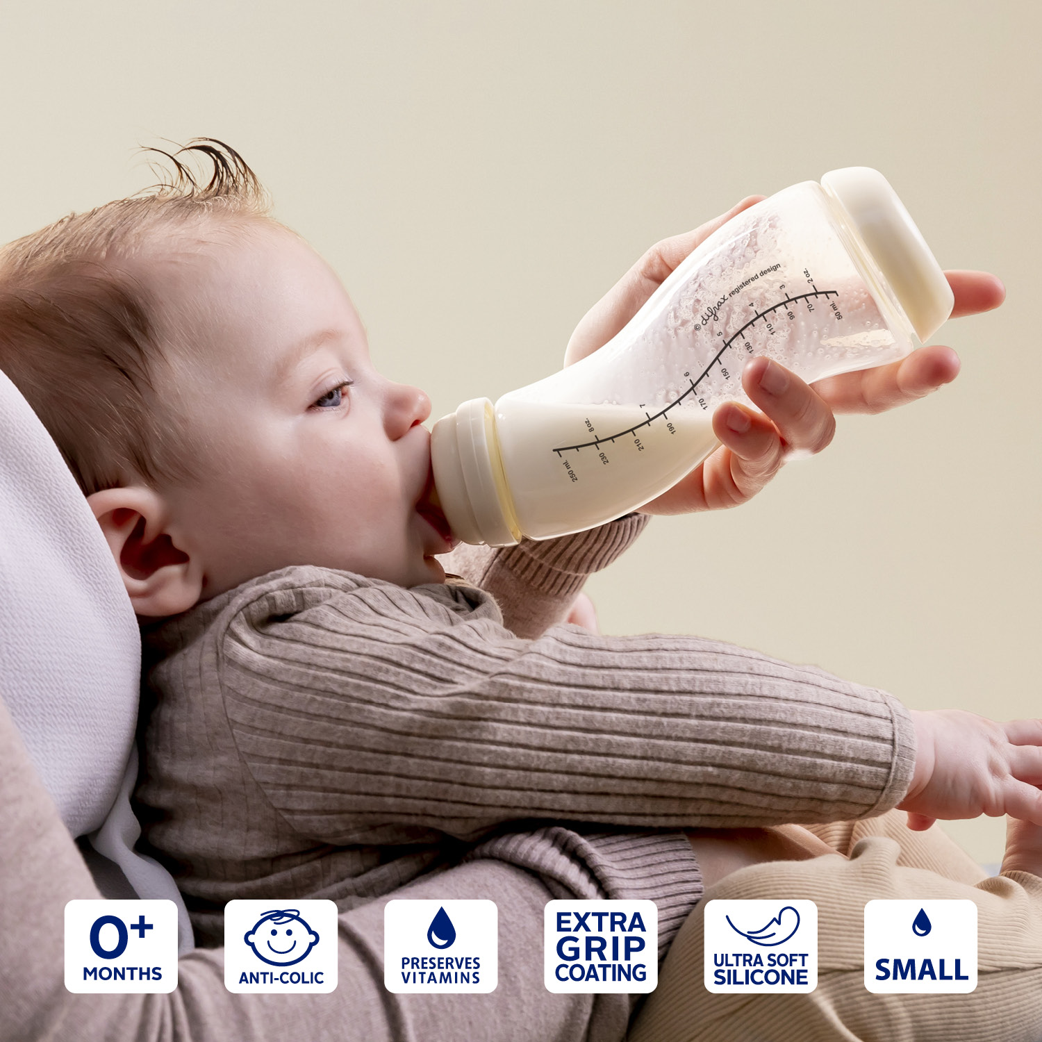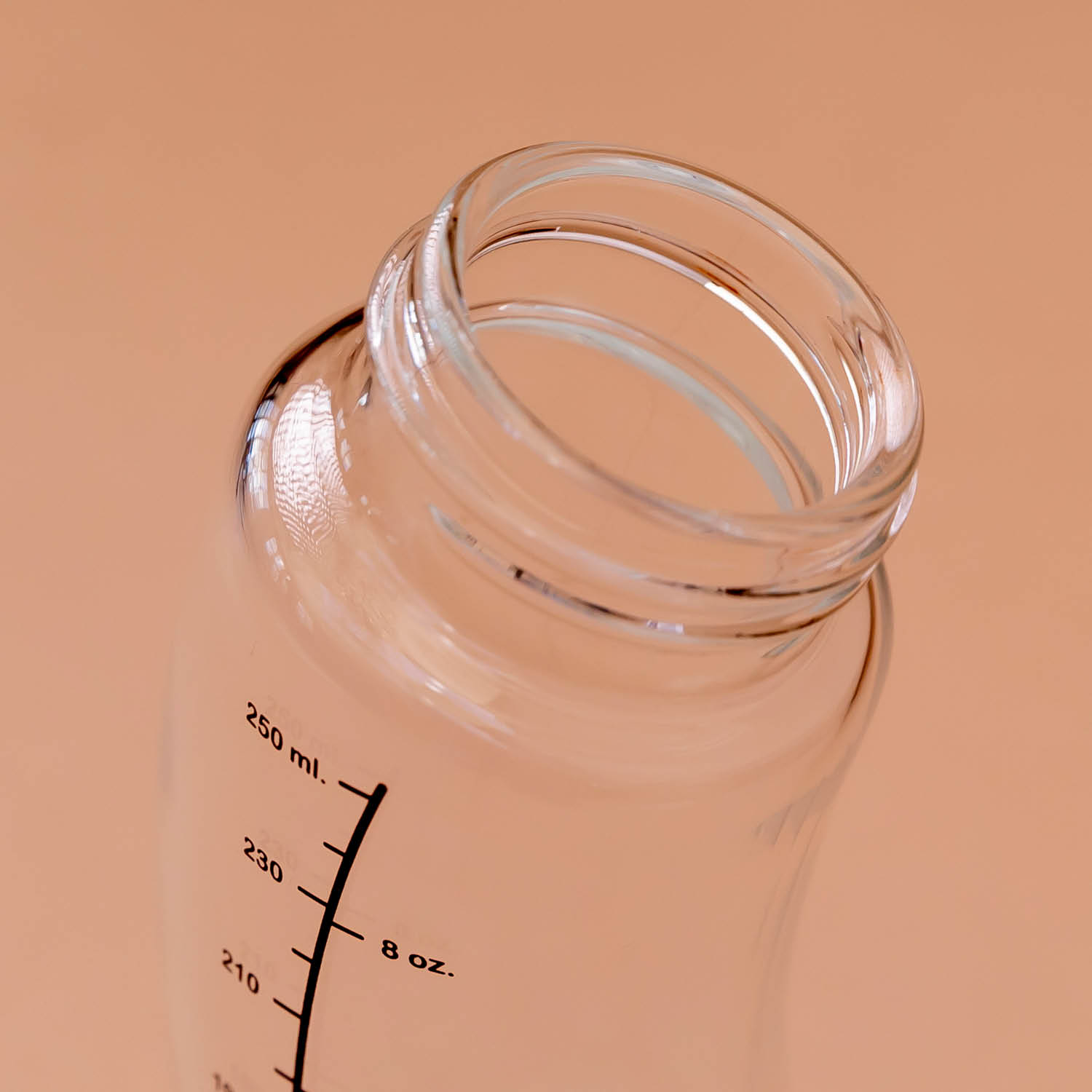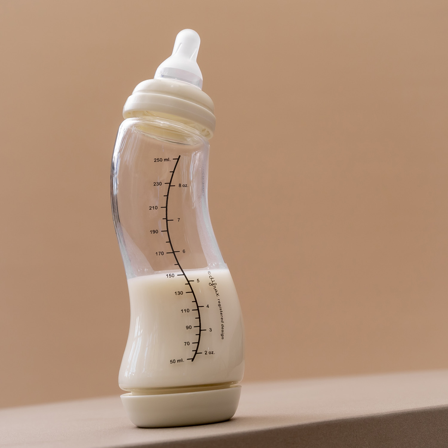 The glass S-bottle 250ml has a patented anti-colic system in the bottom for prevention of intestinal cramps, burps and spitting.