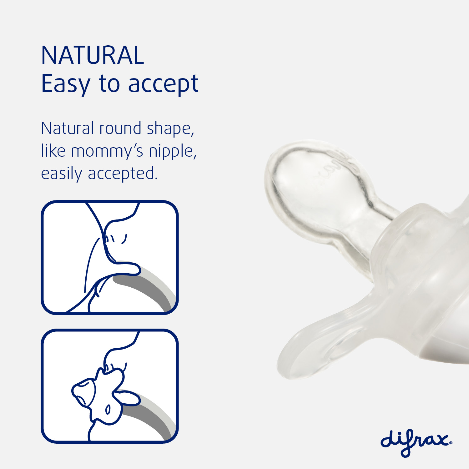 The Difrax Natural Pacifier 0-6 months fulfils your baby’s need to suckle. The pacifier nozzle is round and convex-shaped, making it ideally suited for children who are able to turn the pacifier around in their mouth. The size of the shield and nozzle are specially adapted to new born babies and infants up to 6 months.
