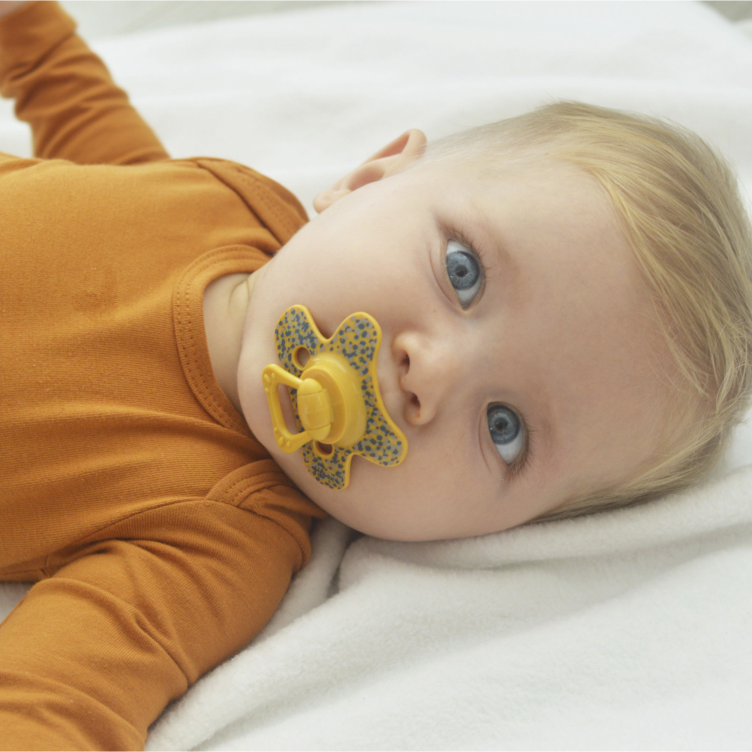 The unique pacifier has a butterfly shaped shield ensuring a perfect fit to your baby’s face. The recess for the nose enables your child to breathe freely through the nose. Two airy holes on each side provide additional airflow, preventing skin irritation.