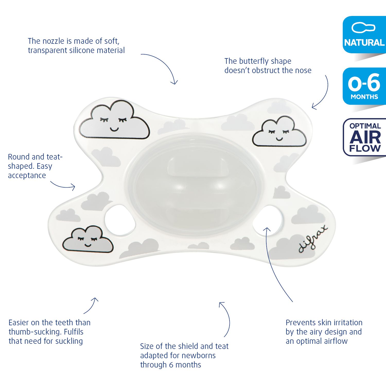 This unique pacifier has a butterfly shaped shield ensuring a perfect fit to your baby’s face. The recess for the nose enables your baby to breathe freely through the nose. Two air holes on each side provide additional airflow, preventing skin irritation.