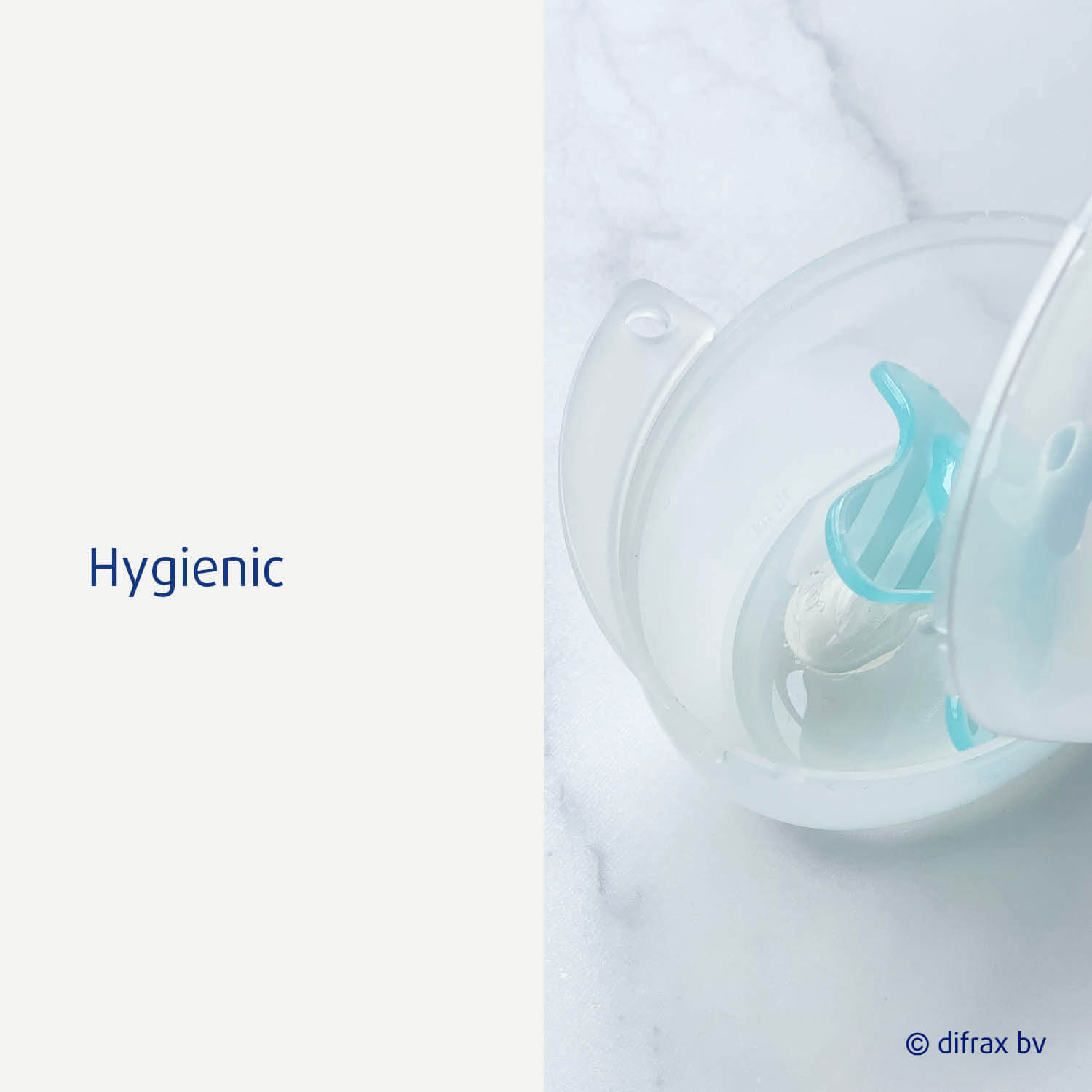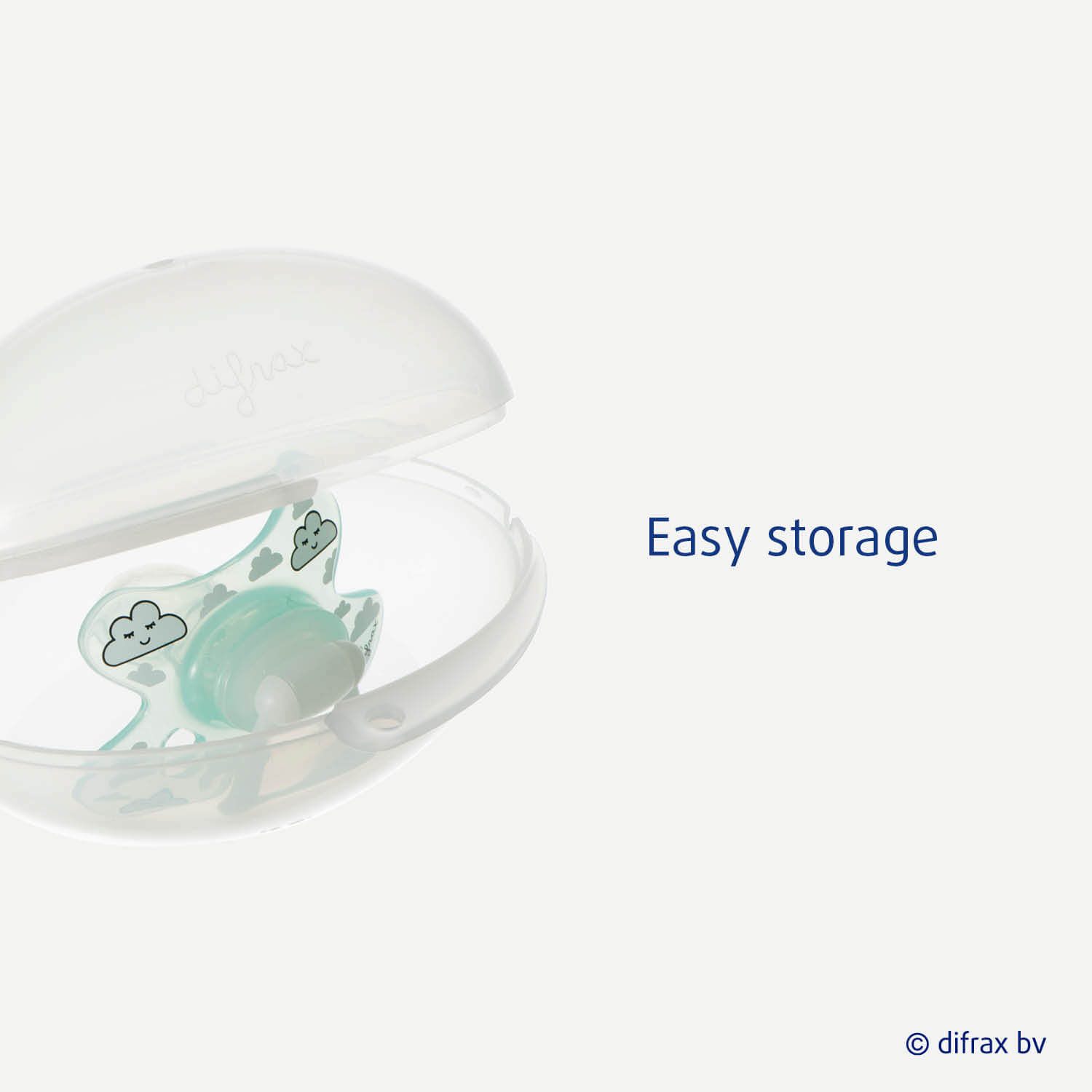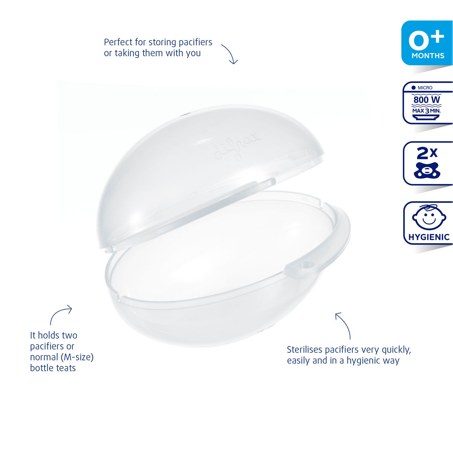 Also suited for storing and transporting pacifiers in e.g. a baby changing bag.