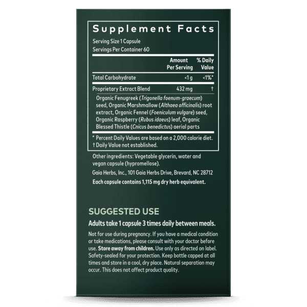 Contains Fenugreek seed, Fennel seed, and Raspberry leaf