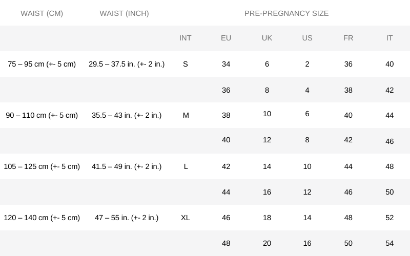 SIZE CHART Fully adjustable fastening panels guarantee a suitable fit. Each band size offers 25cm of adjustability to grow with your belly. MATERIAL COMPOSITION AND CARE INSTRUCTIONS |