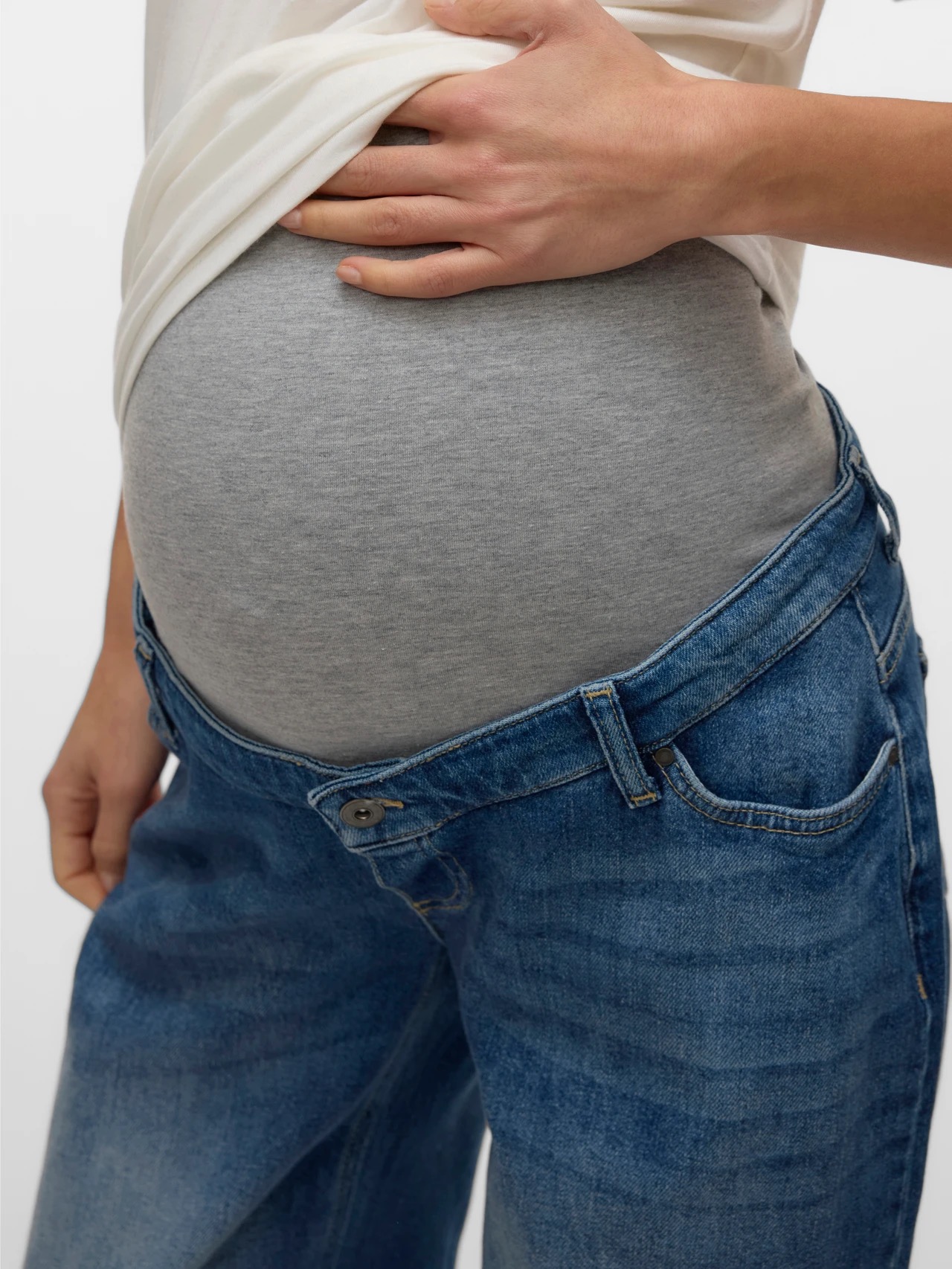 Stay cool in a pair of maternity jeans designed to fit through all stages of pregnancy supporting your bump with an elasticated bump band. – Product Type : Wide-leg maternity jeans – Closing : Faux fly with stitching detail – Pockets : Back pockets, Front pockets – Waist : Mid waist – Extra details : Supporting bump band for extra comfort, Elasticated waist, Bump band over the bump for extra comfort and support – Wash/Finish : Mid wash for a washed and worn-in denim look – Fit : This pair of jeans has a trendy wide fit
