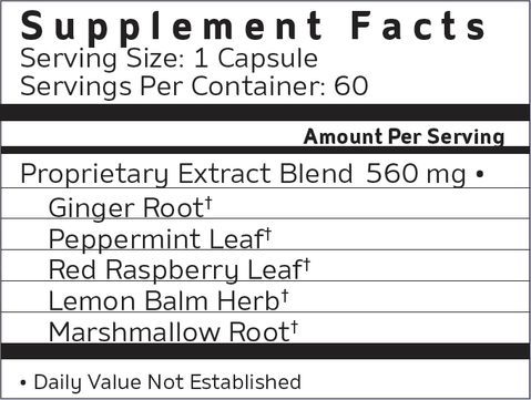 Ginger root*, peppermint leaf*, red raspberry leaf*, lemon balm herb*, marshmallow root*, sunflower lecithin, modified vegetable cellulose, medium-chain triglycerides (derived from palm kernel oil).